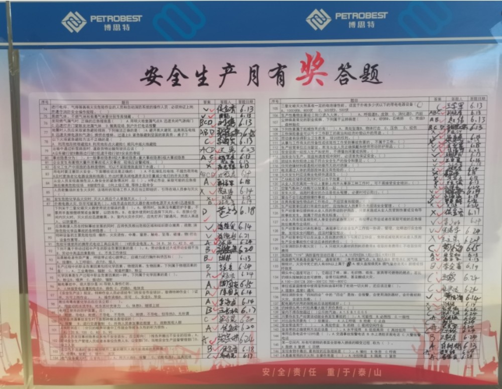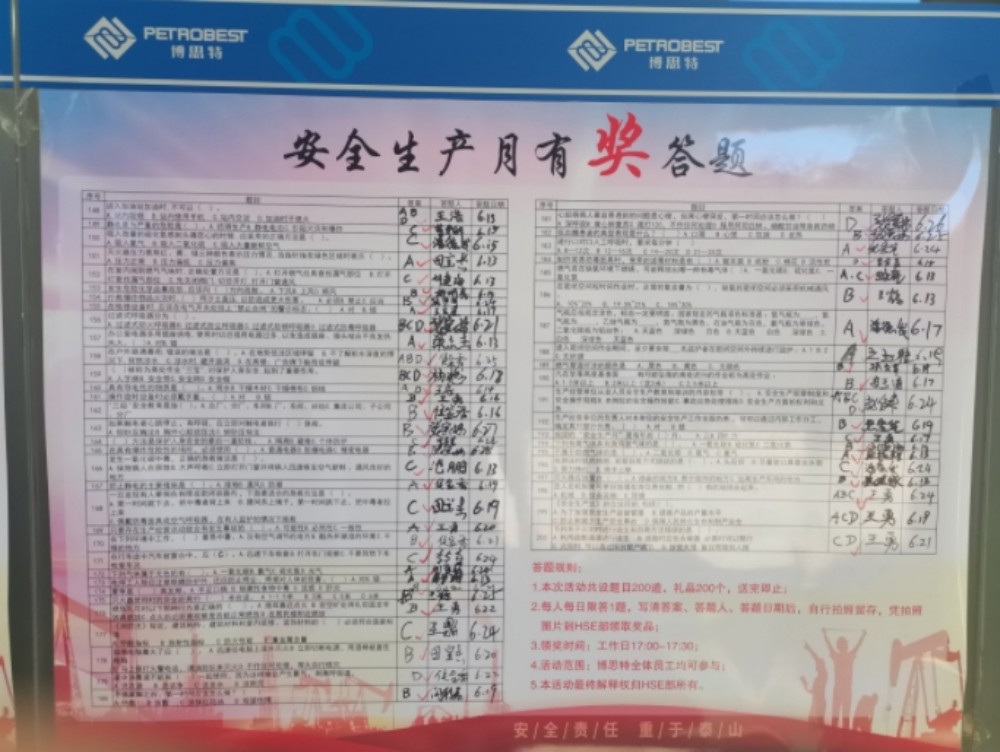 为了达到全体员工人人参与安全生产、人人了解安全生产、人人关注安全生产的目的,公司举办了安全生产知识有奖竞答活动,大家争先恐后参与有奖答题,高高兴兴赢得奖品,纷纷争做安全小“答”人,宣传氛围异常浓厚。