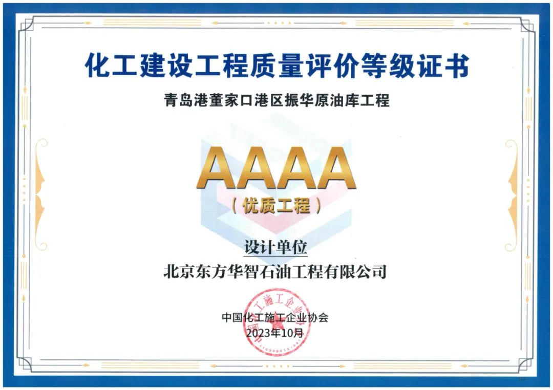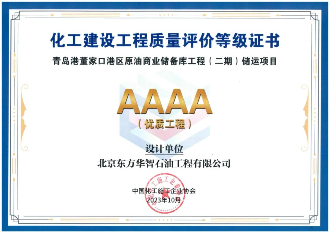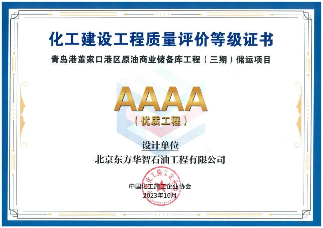 近日,中国化工施工企业协会公布了2023年化工建设工程质量评价结果,由北京东方华智石油工程有限公司设计的青岛港董家口港区原油商业储备库工程二期、三期,青岛港董家口港区振华原油库工程3个项目获评AAAA级优质工程。