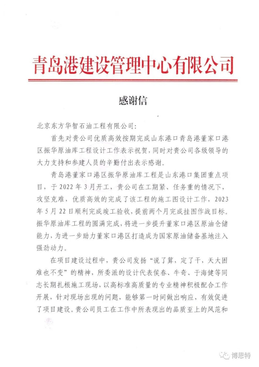 2023年5月26日,北京东方华智石油工程有限公司收到青岛港董家口港区振华原油库工程的业主青岛港建设管理中心有限公司发来的感谢信。该项目于2022年3月开工,2023年5月23日顺利完成竣工验收,建设8座10×104m3储罐。我公司承担了该项目的初设和施工图设计工作。