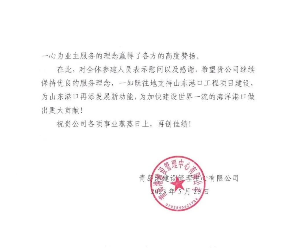 东方华智获青岛港董家口港区振华原油库工程感谢信
