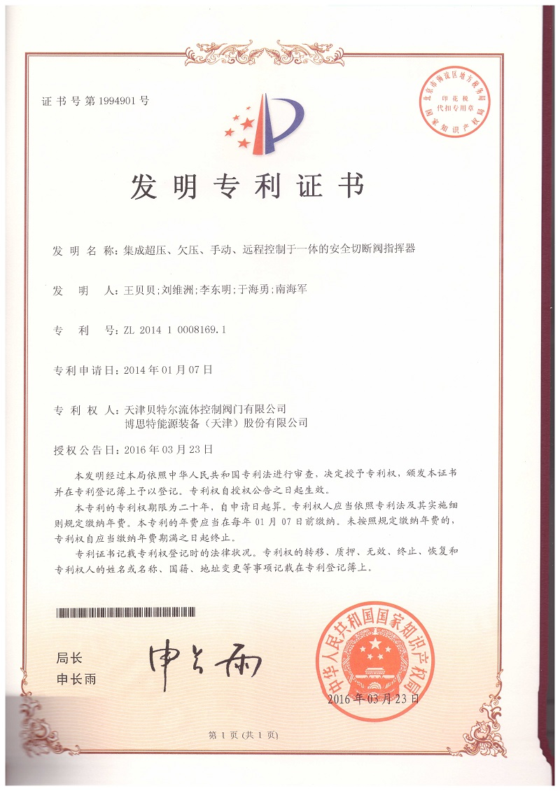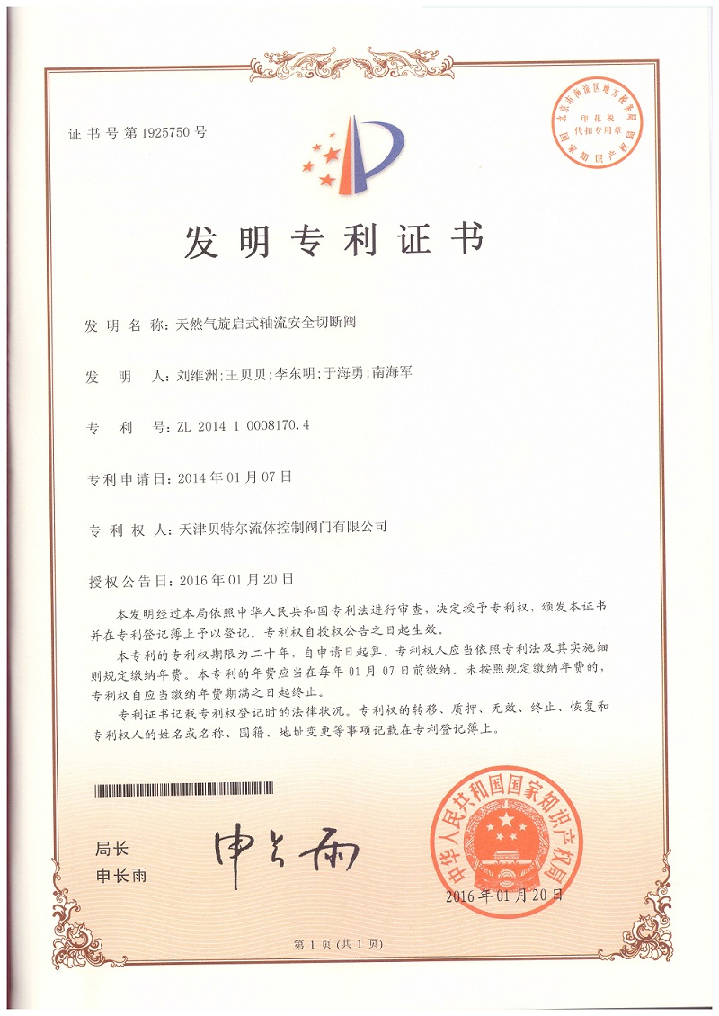 近日,贝特尔获得国家知识产权局颁发的两项发明专利,《天然气旋启式轴流安全切断阀》和《集成超压、欠压、手动、远程控制于一体的安全切断阀指挥器》。两项发明专利为天然气管道输送中的关键设备-安全切断阀增加了多种功能,并提高了其安全系数。